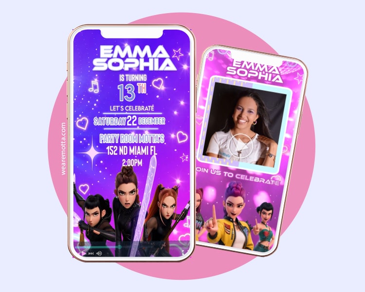 K-POP, K-POP Warriors, Huntrix, Rumi, Mira, Zoey, fight demons, girls warriors, digital video invitation, KPOP idols, kids birthday, animated invite, party theme KPOP, warriors vs demons, heroes KPOP